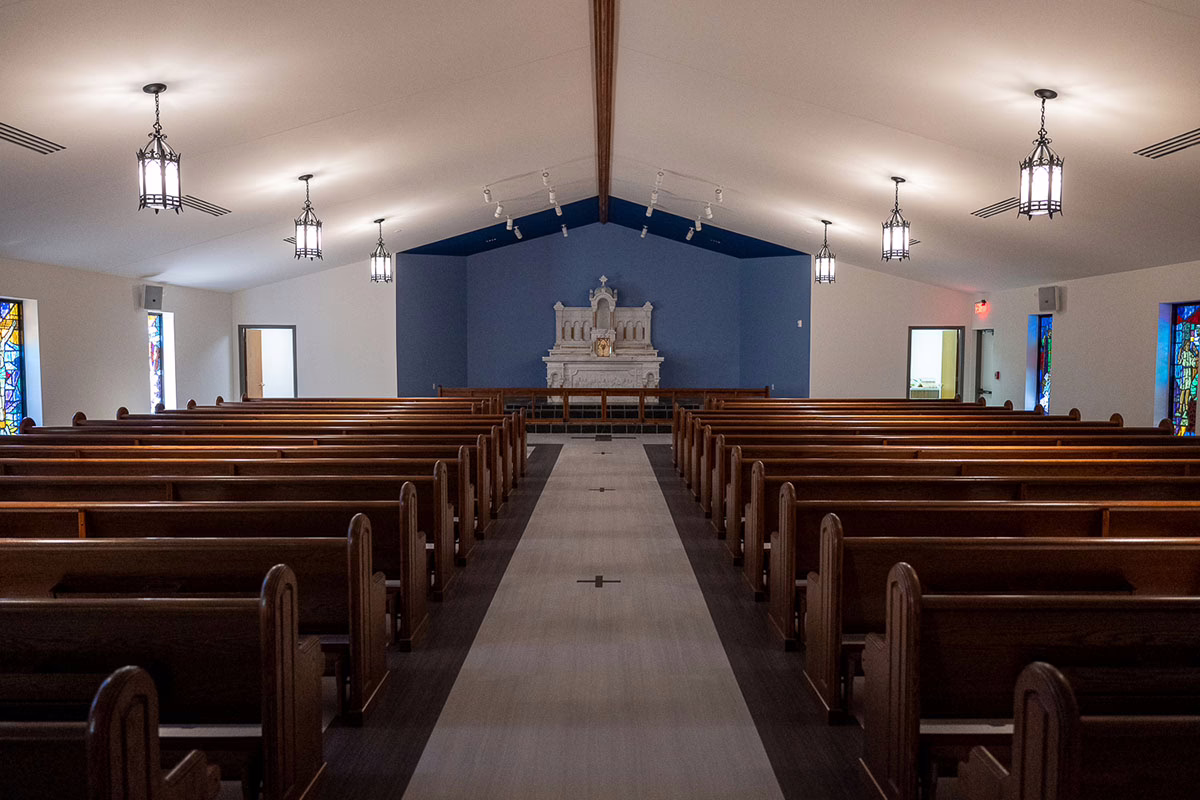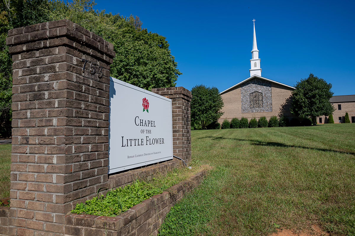The Chapel of the Little Flower offers the celebration of the Traditional Latin Mass in the Diocese of Charlotte. Its name is derived from nearby St. Thérèse Parish in Mooresville, honoring the way St. Thérèse of Lisieux described herself as “The Little Flower.” The 5,000-square-foot chapel seats 364 people and features a white marble altar with a striking carved relief of the Last Supper.