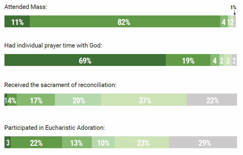 Furthermore, 46% of respondents said they participate in a Catholic devotion (such as praying the rosary) at least weekly, 36% said they attend a Bible study at least weekly, and 25% go to Eucharistic Adoration at least weekly.