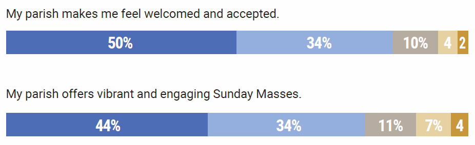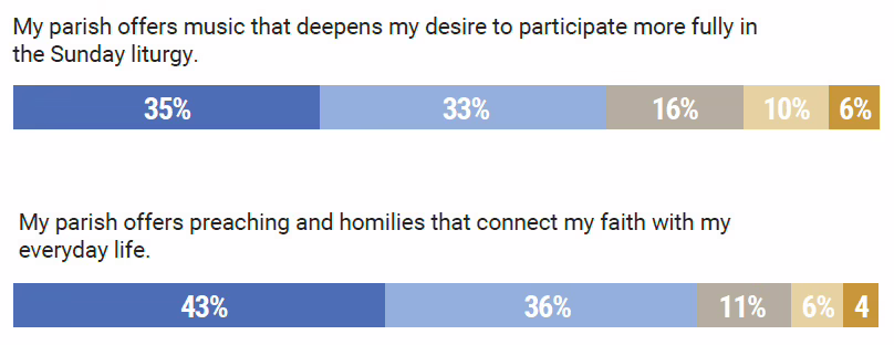 - Of the Sunday Mass experience, only 35% strongly agreed that their parish offers music that deepens their desire to participate more fully in the liturgy.