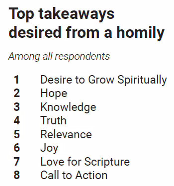 Homilies should connect faith with daily life, and clergy who preach well inspire people to greater discipleship, CLI advises. Parishioners who appreciate their priest’s homilies are 1.7 times more likely to recommend their parish to a friend, its research has found.