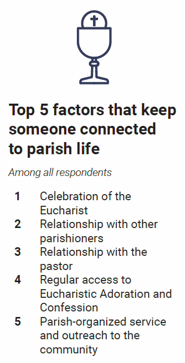 Respondents said besides the Eucharist, relationship with other parishioners is the next biggest factor that keeps them connected to parish life. Yet only 34% of respondents said they “strongly agreed” that their parish provides a community to support them or their family in times of need.