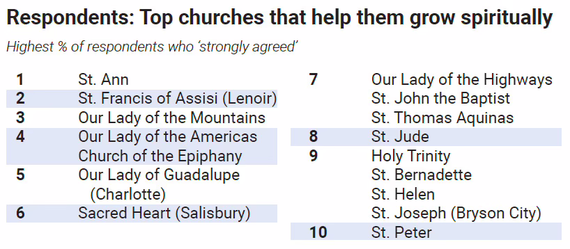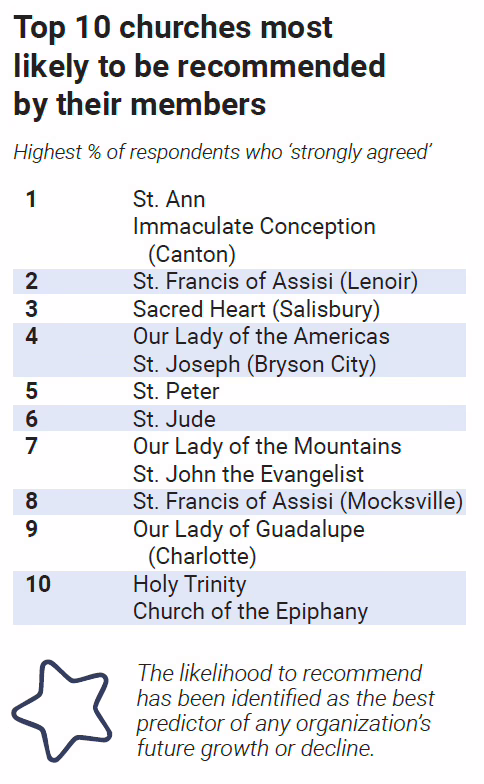 So which parishes have created an exemplary Sunday experience, according to DMI respondents? Thirty-five of the diocese’s churches scored above the diocese’s average, chief among them: St. Francis of Assisi, St. Joseph in Bryson City and St. Ann in Charlotte.
