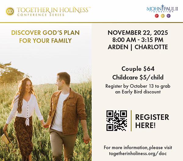 Together in Holiness is a marriage conference series designed to inspire spouses to grow together in holiness and empowers parents to form their children in the Catholic faith. Presented by the St. John Paul II Foundation and the Diocese of Charlotte, this conference offers a place of encounter, where God’s plan for marriage and family is proclaimed and a desire for holiness is enkindled in the hearts of married couples. This year, the conference is being held November 22nd in two locations: Charlotte and Arden. Our conference theme for this year is Courageous Hope in Marriage and Family.
